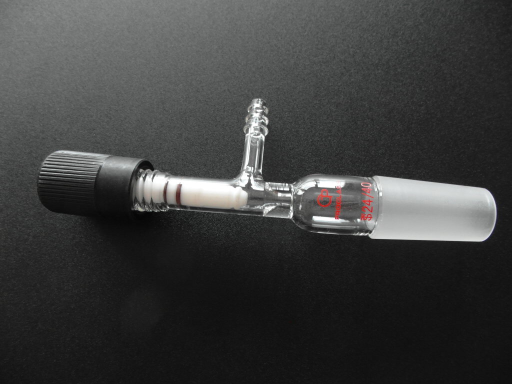 Adapter allows standard single neck round bottom flasks to be used as storage vessels. Sampling can be accomplished by removing 0-4mm plug while maintaining inert gas purge thru sidearm. Available with a choice of 14/20 or 24/40 standard taper inner joint.