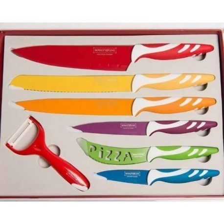Eksklusivt knivsett i 7 deler fra Royalty Line. Knivene dekker de fleste behov på kjøkkenet og har Non-Stick belegg som gjør at frukt og grønt ikke henger fast i knivene. Settet leveres i lekker gaveeske. Spesifikasjoner: Knivblader i rustfritt stål Ergonomisk gummihåndtak Egen pizza kniv Potetskreller i tillegg Størrelse knivblader: 20 cm (3), 12 cm (2), 8 cm (1)