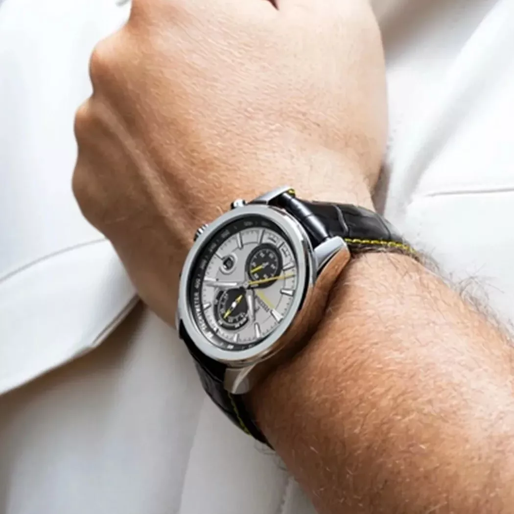 Festina Timeless, uåpnet eske, bredde 44mm på ur. Edelstål kasse, vanntett til 100m. Mineralglass. Lysindekser. Lyspeker. Datovisning. Lærreim med gul søm.