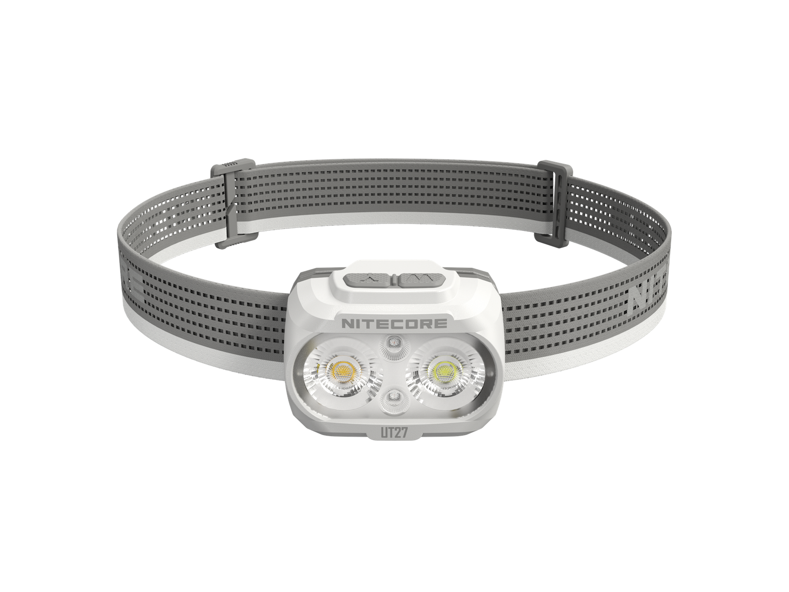 Hodelykt HVITGRÅ UTGAVE fra Nitecore UT27. Oppladbar med USB-C. Nitecore UT27 er en ultralett hodelykt som veier kun 74 gram, utviklet for løping, fotturer og utendørsaktiviteter. Den kombinerer kaldt hvitt lys (5700K), varmt lys (3000K) og rødt lys, med en maksimal lysstyrke på 800 lumen og en rekkevidde på opptil 168 meter. Den drives av et oppladbart HLB1500 Li-ion-batteri (inkludert) eller tre AAA-batterier (ikke inkludert). Hodelykten er IP66-klassifisert og støtsikker opptil 1 meter.