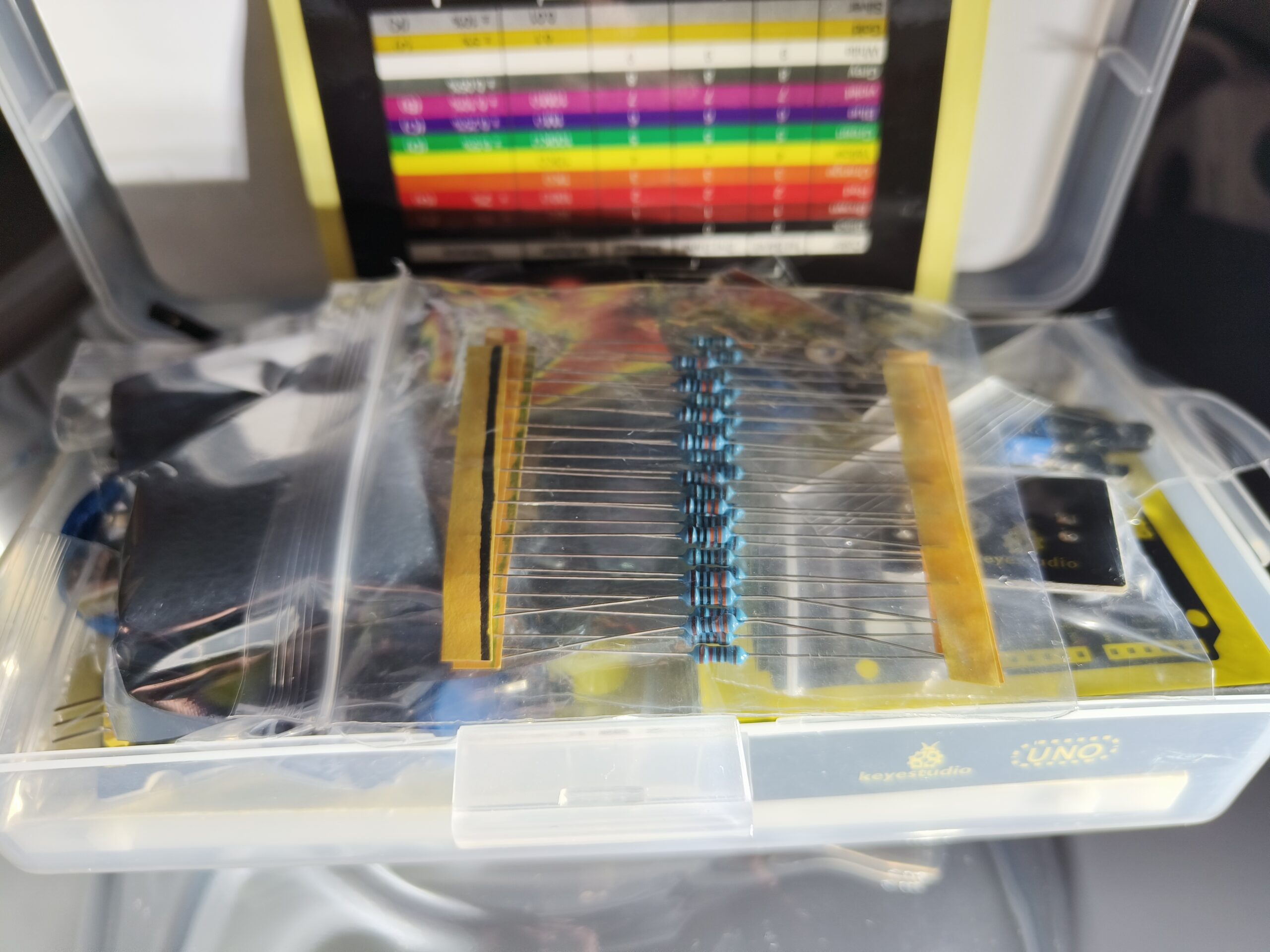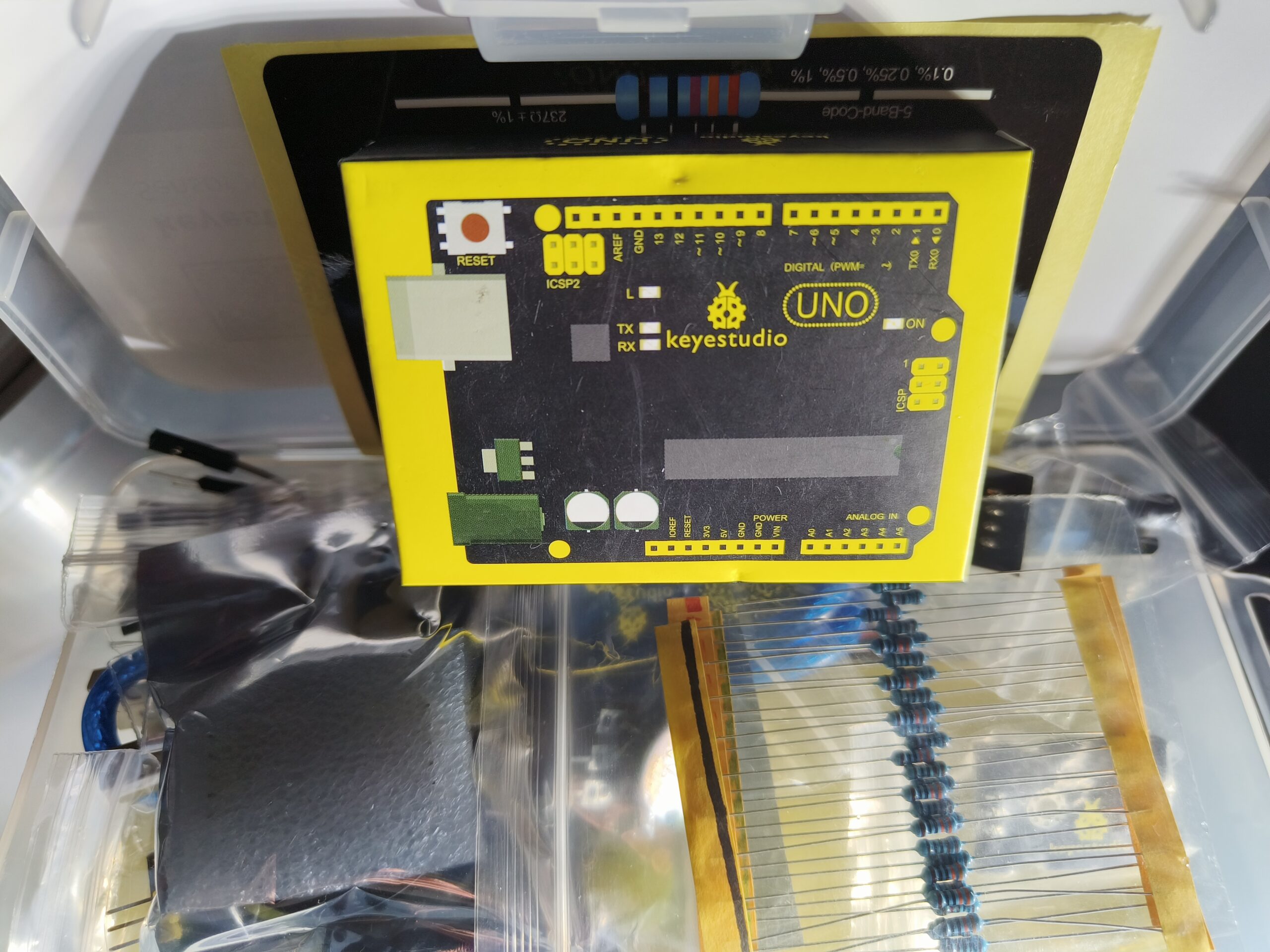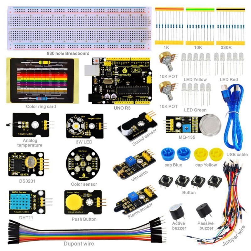 Kit list: UNO R3 controller board *1 3W LED Module *1 Push Button module *1 Analog temperature sensor Module *1 DHT11 Temperature and Humidity Sensor module *1 Sound sensor module *1 Flame sensor module *1 Vibration sensor module *1 DS3231 Clock Module *1 MQ135 Air Quality Sensor module *1 Color sensor module *1 Potentiometer 10K *2 Passive buzzer *1 Active buzzer *1 830-hole Breadboard *1 Resistor 330R *10 Resistor 1K *10 Resistor 10K *10 LED Red *5 LED Yellow *5 LED Green *5 Button *4 Button cap Blue *2 Button cap Yellow *2 Jumper wire *65 M-F Dupont wire 20cm *10 Resistor color code card *1 USB cable 0.5m *1 Component box *1