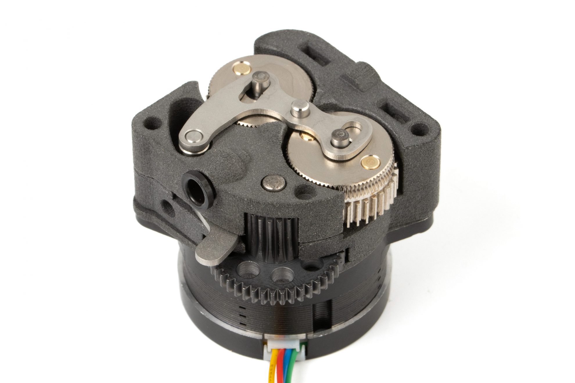 En uppsättning delar av härdat stål för att ersätta driv- och huvudhjulet i plast på en Bondtech Large Gears eXtruder.