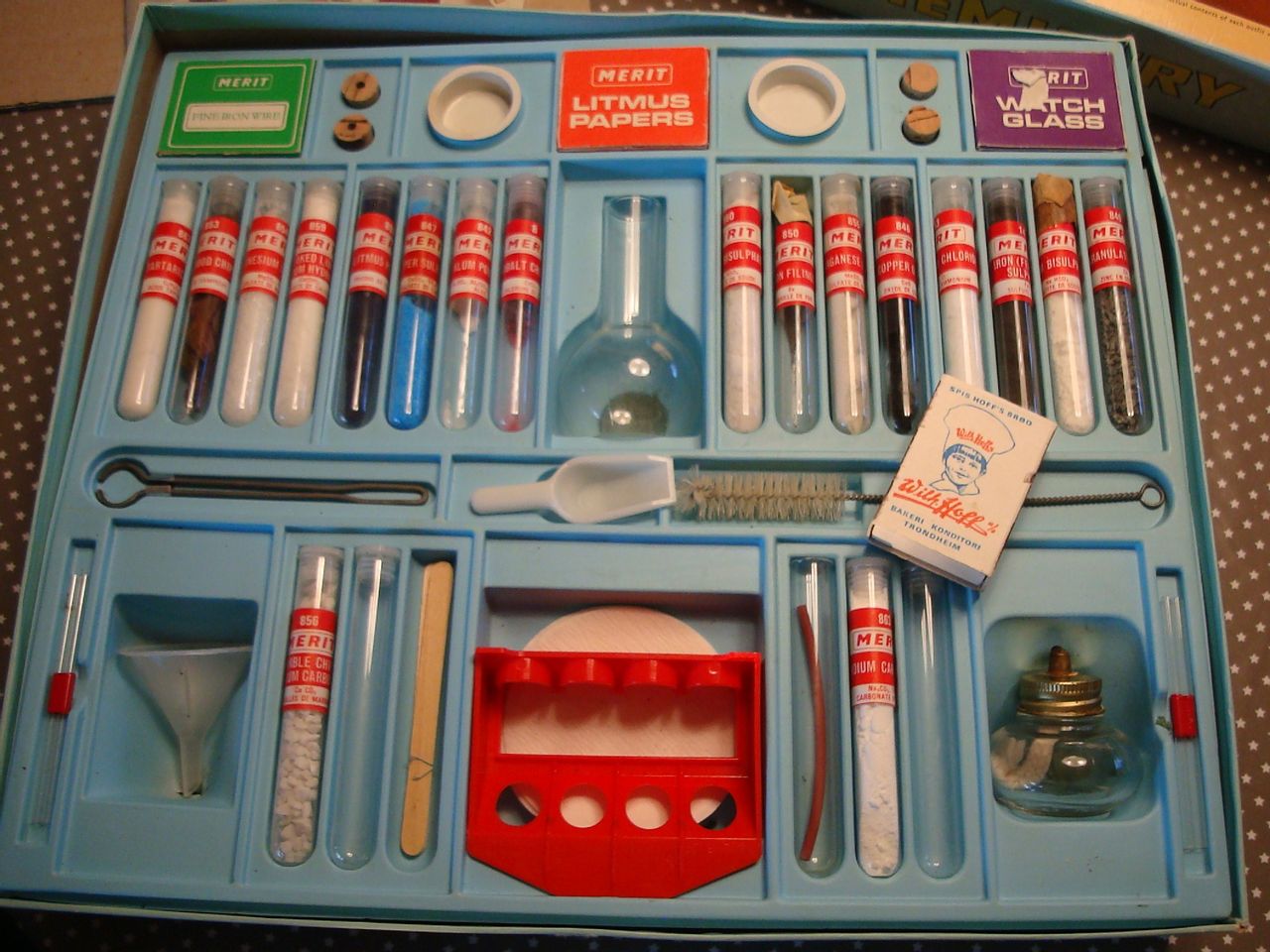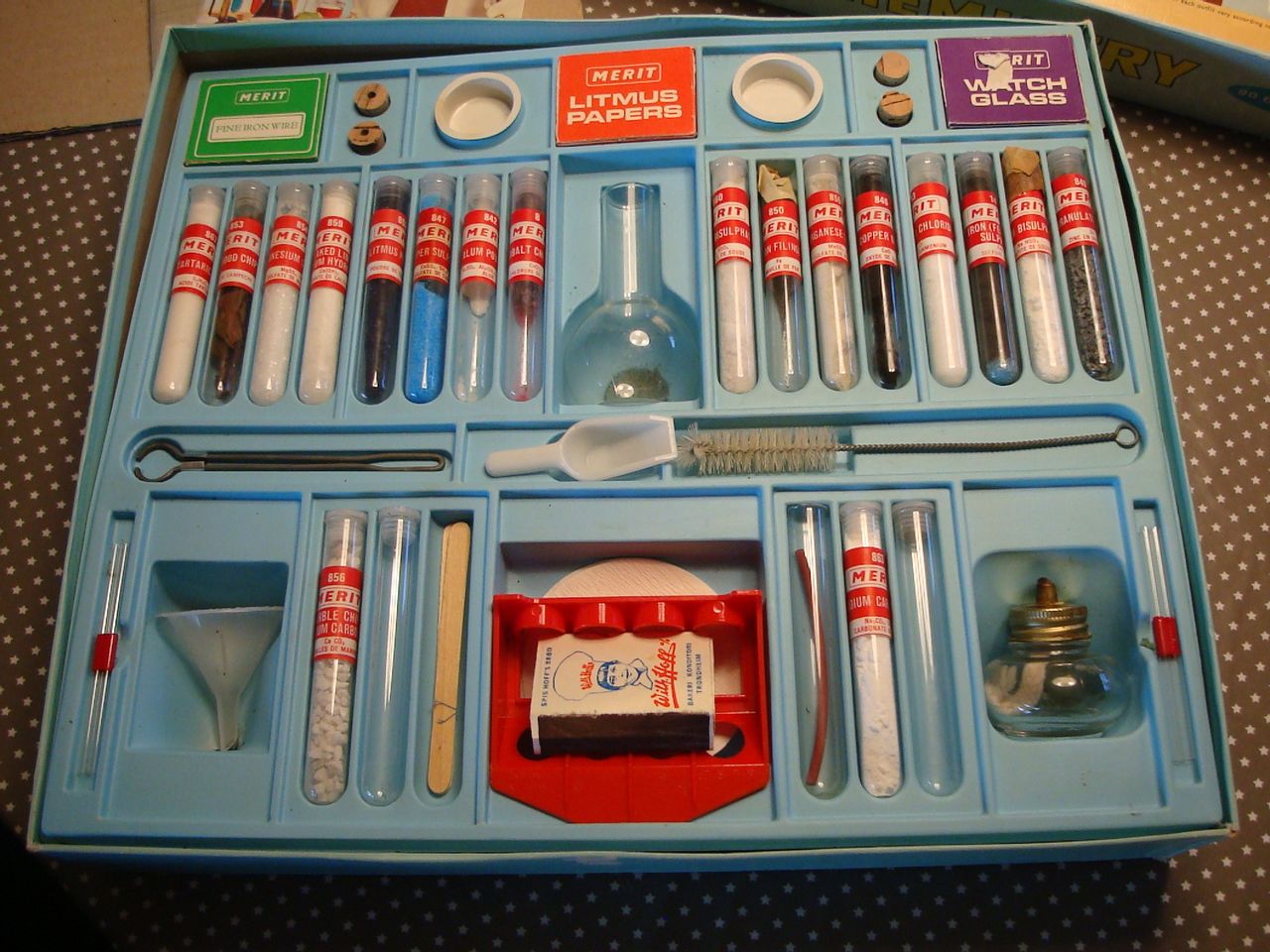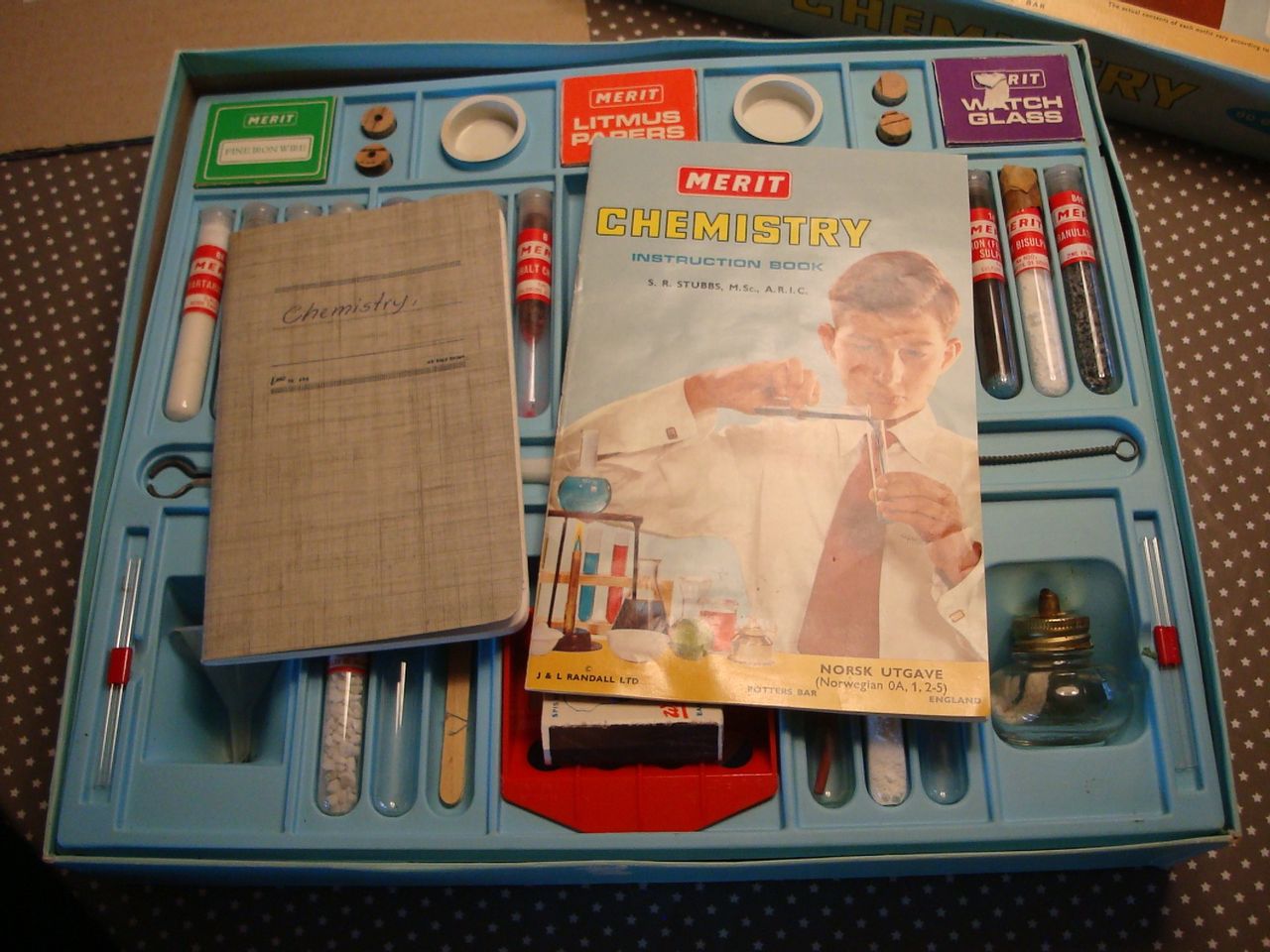 Brukt gammelt, kan mangle flere ting ikke sett over særlig. Meget populært engelsk sett med mange deler med. Er en bok med noen tester er notert. Flott vintage 60-talls kjemi sett, pen stand, nesten komplett, her er det mange timers underholdning med 147 forsøk.