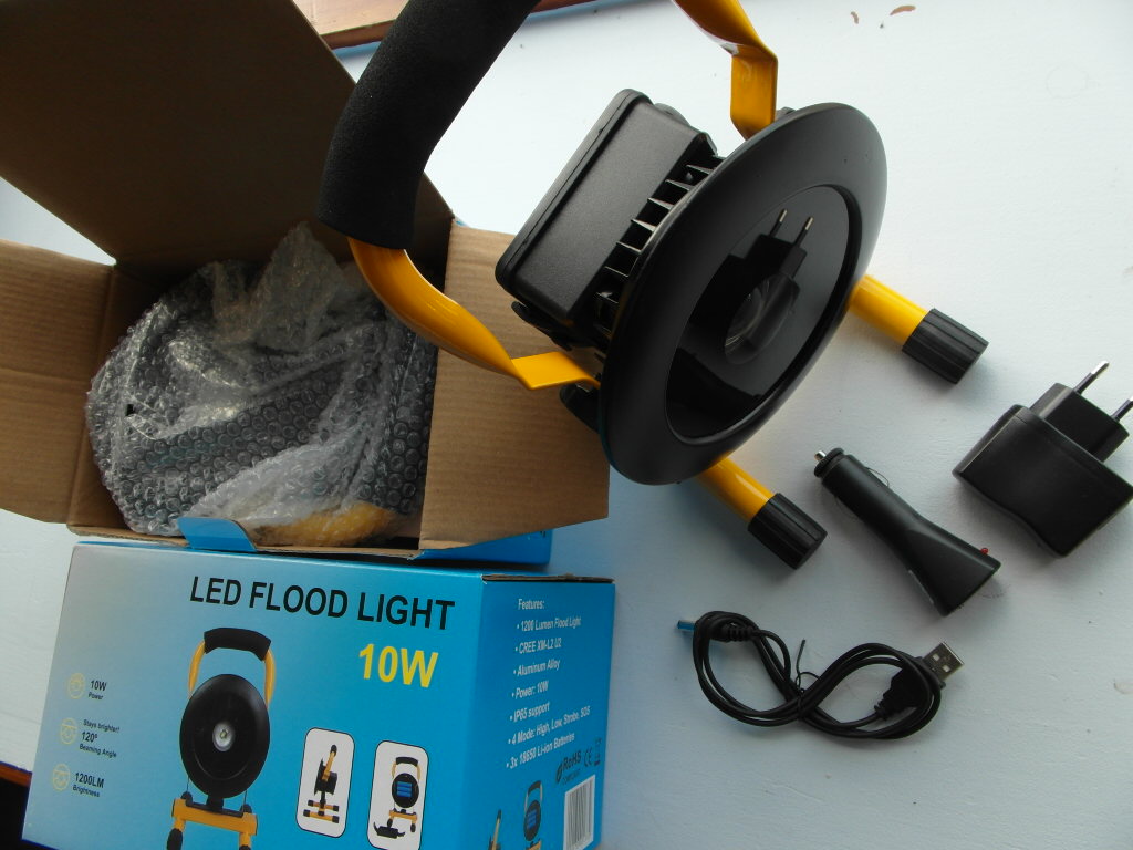 Med 1 stk lader og 1 stk billader. Kan bæres og kan stå stødig på gulv og har justerbar vinkel. 1200Lumen 10w. Blir testa at tar lading.