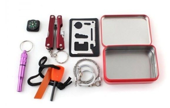 Inneholder: 1. SOS metallboks 2. Multi-tool med LED-blits lys, kniver, sakse og nøkkelring 3. Tennstål 4. Wire sag 5. Kompass 6. Fløyte + Vanntett oppbevaringsrom for småting 7. Multiverktøy kort med mange funksjoner. Multifunksjons verktøy kort: (har følgende funksjon) Boks åpner side kniv rett skrutrekker Linjal Flaskeåpner Utenfor sekskantnøkkel Clyburn skiftenøkkel Sag retning identifikator posisjonering skiftenøkkel