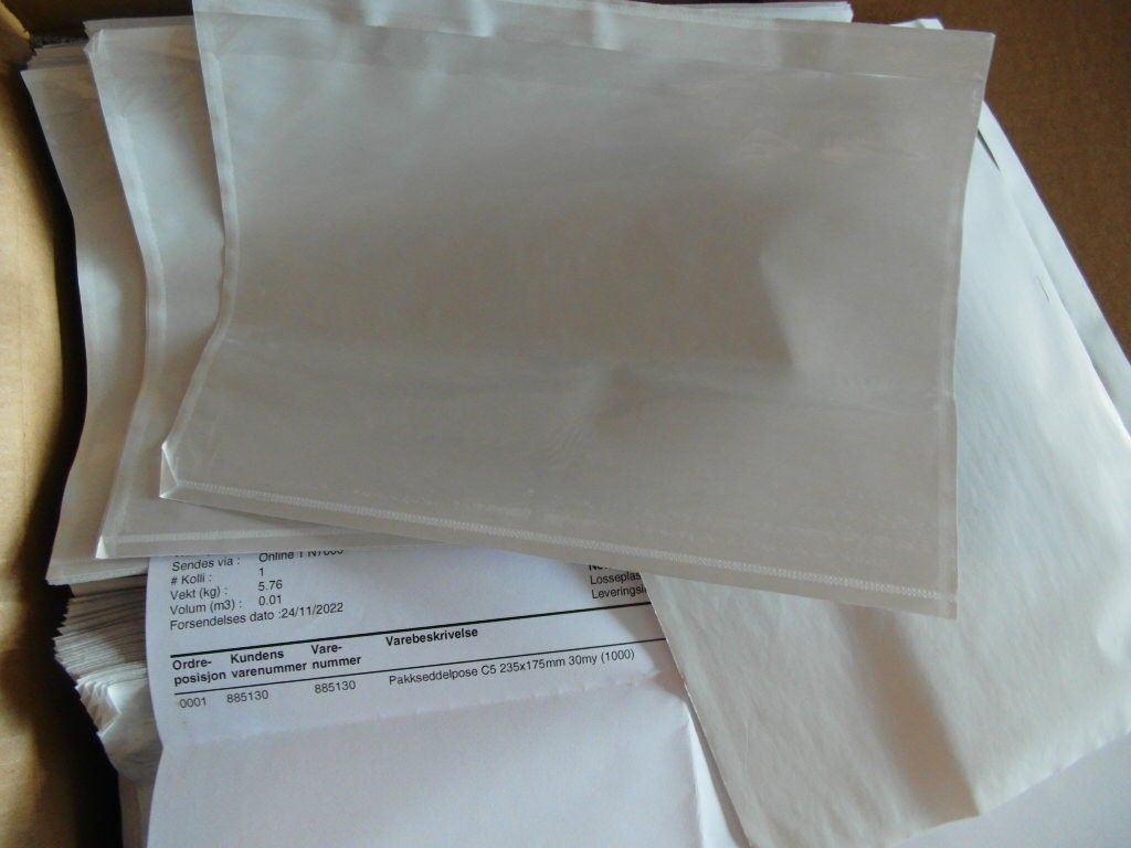 Gjennomsiktige plastlommer med lim på baksiden til å feste på pakker som sendes i posten der du printer ut porto lappen selv, brukes og til pakkseddel fraktseddel, så en slipper masse tape bruk. KR 1 pr stk.