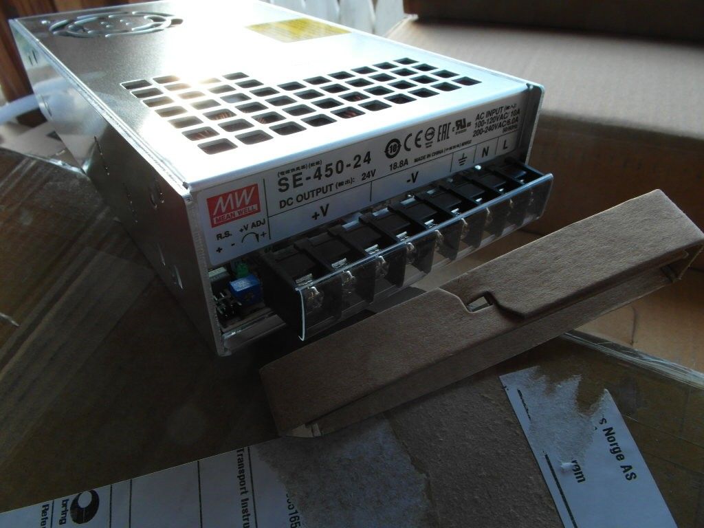 Selger en ubrukt Meanwell 18,8A 24V SE-450 kjøpt i reserve til 24v 3d printer fra Mean Well fabrikken, sammen med en LRS-350 14,6A 24V kom det på 188 dollar. De 2 er de mest solgte og har lite og ingenting negativ omtale, men du må vite nøyaktig hvordan koble de, har du en fra før er det enkelt å ta bilde av før demontering. Innebygd stillegående Sunon vifte. Den kan brukes til 3d printer eller for strøm til LED belysninger i hus.