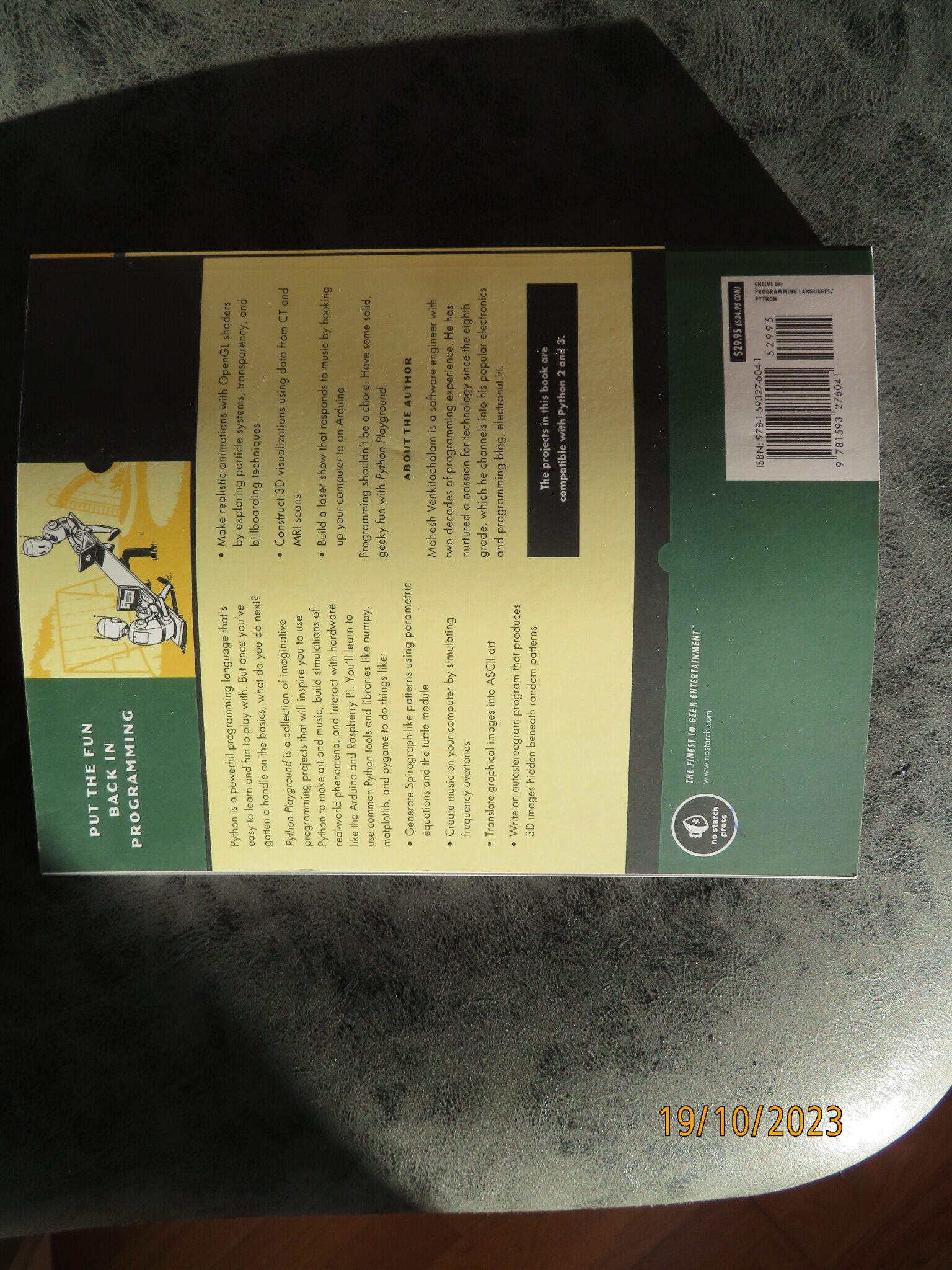Ny bok eller pocket er korrekt uttrykk Utgitt 2016, kjøpt i bokhandel til en samling nå nylig, men er solgt fra igjen så kan alltids selge Engelsk, 352 sider. Info: Python is a powerful programming language that s easy to learn and fun to play with. But once you ve gotten a handle on the basics, what do you do next? Python Playground is a collection of imaginative programming projects that will inspire you to use Python to make art and music, build simulations of real-world phenomena, and interact with hardware like the Arduino and Raspberry Pi. You ll learn to use common Python tools and libraries like numpy, matplotlib, and pygame to do things like: Generate Spirograph-like patterns using parametric equations and the turtle module Create music on your computer by simulating frequency overtones Translate graphical images into ASCII art Write an autostereogram program that produces 3D images hidden beneath random patterns Make realistic animations with OpenGL shaders by exploring particle systems, transparency, and billboarding techniques Construct 3D visualizations using data from CT and MRI scans Build a laser show that responds to music