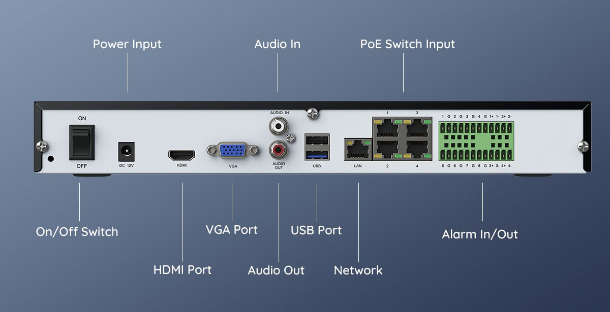 Den har også ekstra alarm inn/ut kanaler for å tilpasse ulike deteksjons-/responsmoduser. Opptakene som produseres kan trygt lagres i opptil 3 stk. 16TB HDD-er (medfølger ikke).