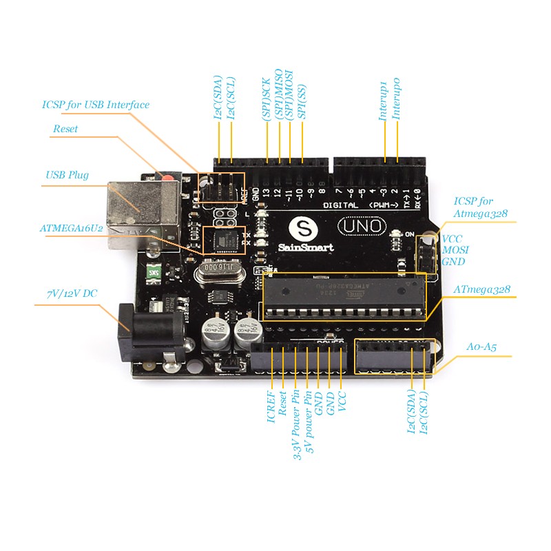 The Sainsmart Uno R3 is a microcontroller board based on the ATmega328 . It has 14 digital input/output pins (of which 6 can be used as PWM outputs), 6 analog inputs, a 16 MHz ceramic resonator, a USB connection, a power jack, an ICSP header, and a reset button. It contains everything needed to support the microcontroller; simply connect it to a computer with a USB cable or power it with a AC-to-DC adapter or battery to get started. Revision 3 of the board has the following new features: 1.0 pinout: added SDA and SCL pins that are near to the AREF pin and two other new pins placed near to the RESET pin, the IOREF that allow the shields to adapt to the voltage provided from the board. In future, shields will be compatible with both the board that uses the AVR, which operates with 5V and with the Sainsmart Due that operates with 3.3V. The second one is a not connected pin, that is reserved for future purposes. Stronger RESET circuit. Atmega 16U2 replace the 8U2.