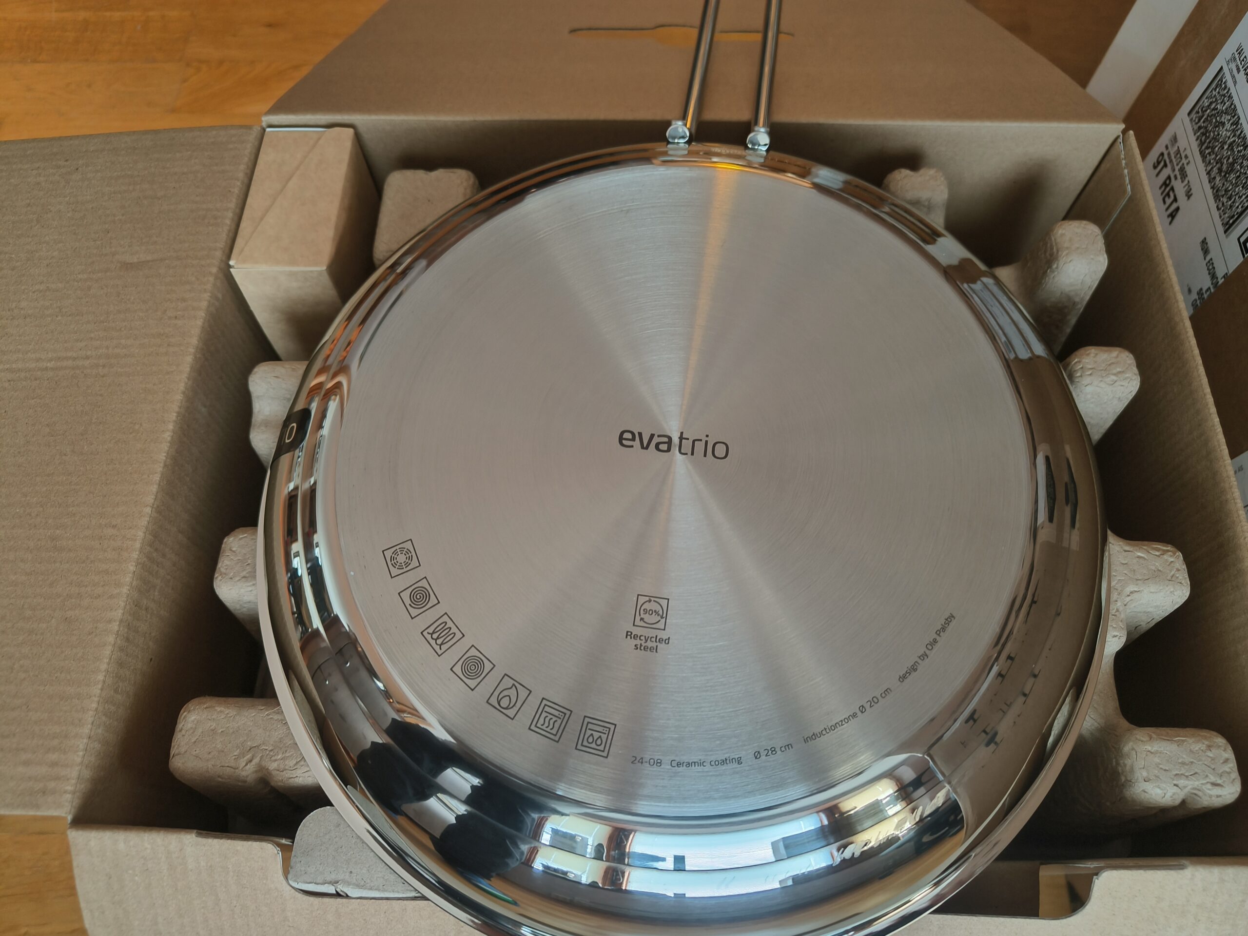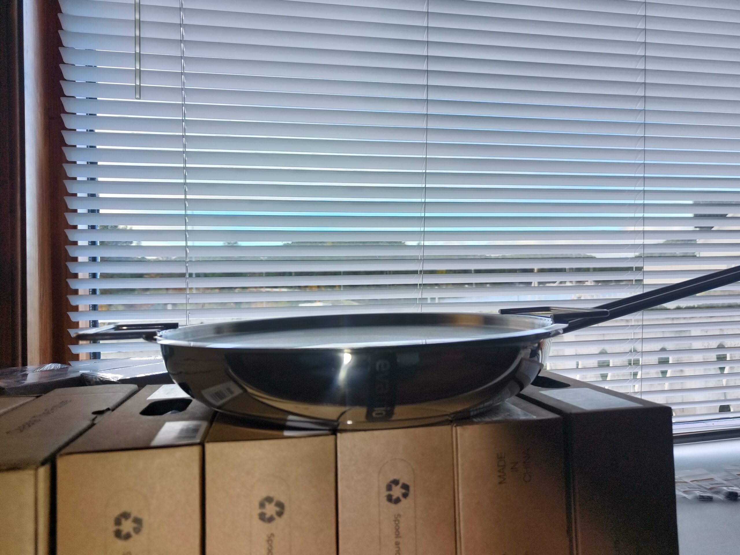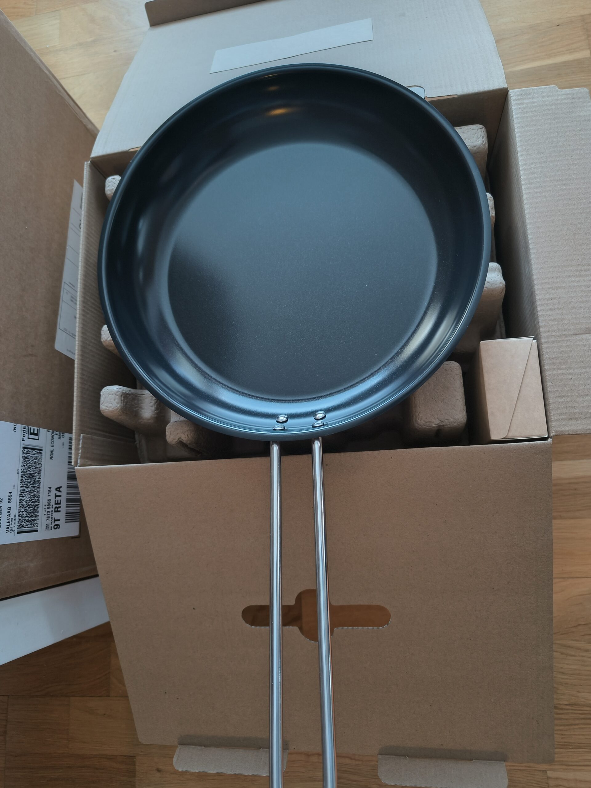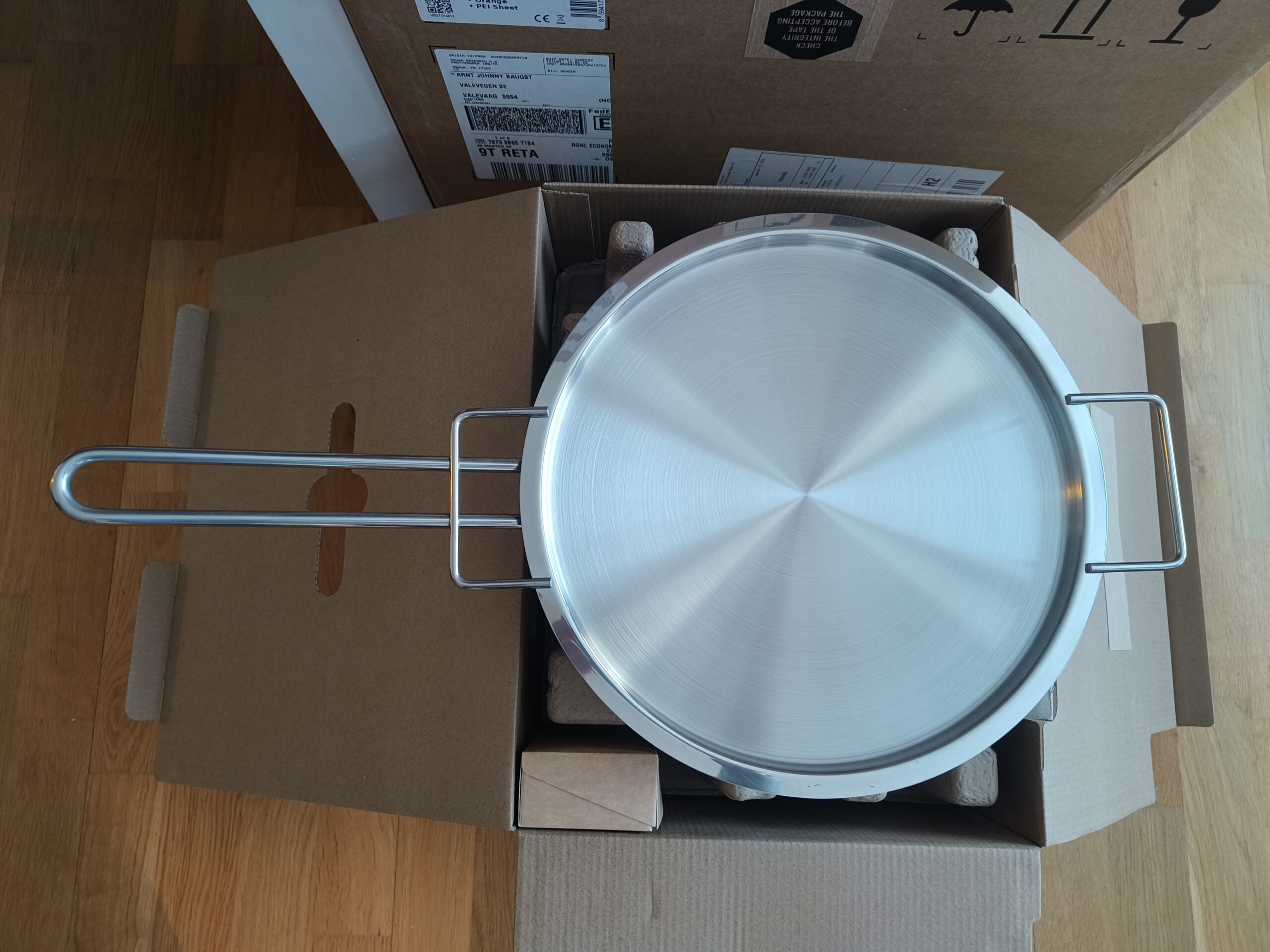 Lagd av resirkulert rustfritt stål, både stekepanne og lokk som matcher, kjøpt til utenom.