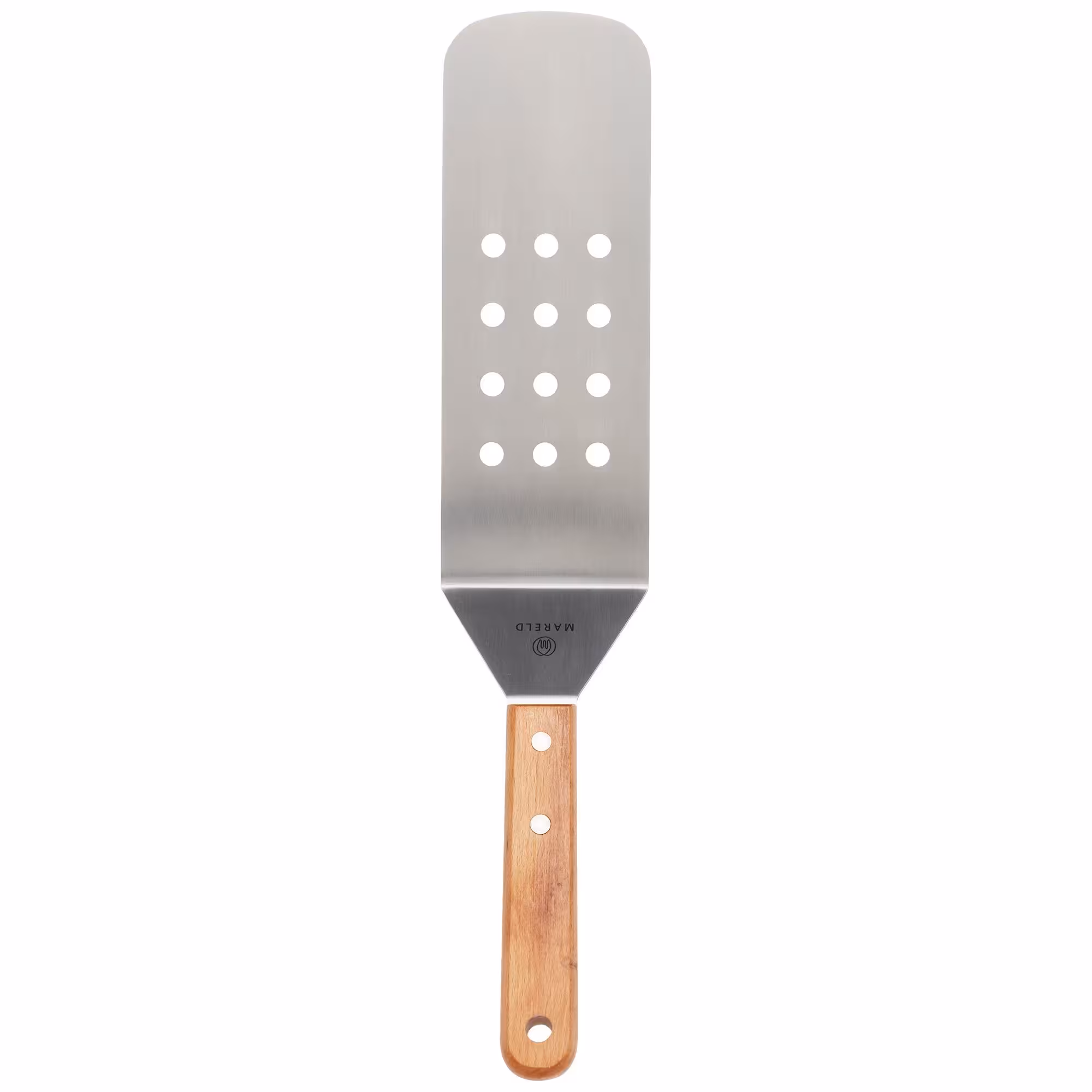 Selger en ubrukt stor stekespade, egnet for store hamburgere og store biffer. Lengden på 38cm gjør den og godt egnet til bruk over grill på sterk varme. Håndtak av bøk.