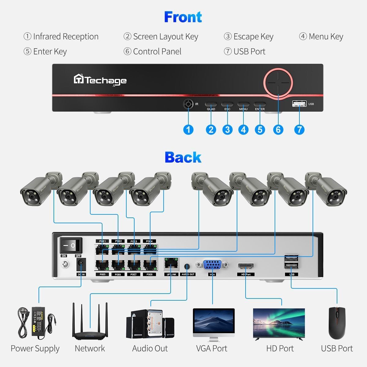 RELATED INFO:✨ Surveillance video recorder: the POE NVR is equipped with high-definition image, which can automatically record video and keep you away from danger.  ✨ Techage 8CH POE NVR video recorder: this techage nvr is equipped with 8 channels, you can connect the NVR with 8CH POE switch to expand the NVR to 16 channels.