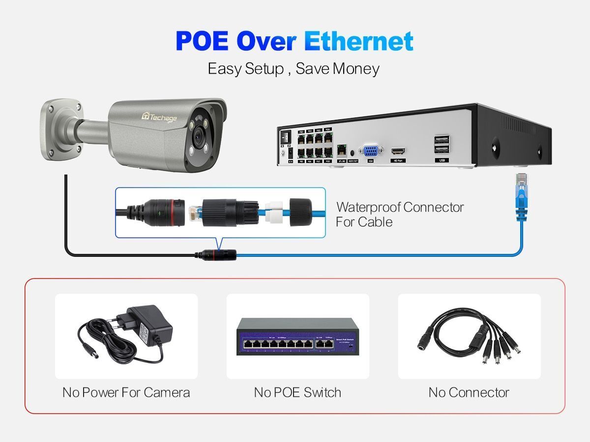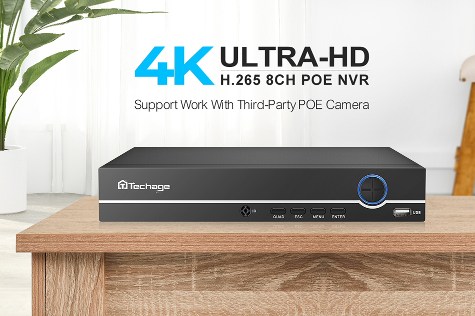 1. Our New 4K POE Camera System. 8 Channel NVR Design, Support To Connect Up To 8pcs Cameras, You Can Buy Techage POE IP Cameras To Expand Your CCTV System.