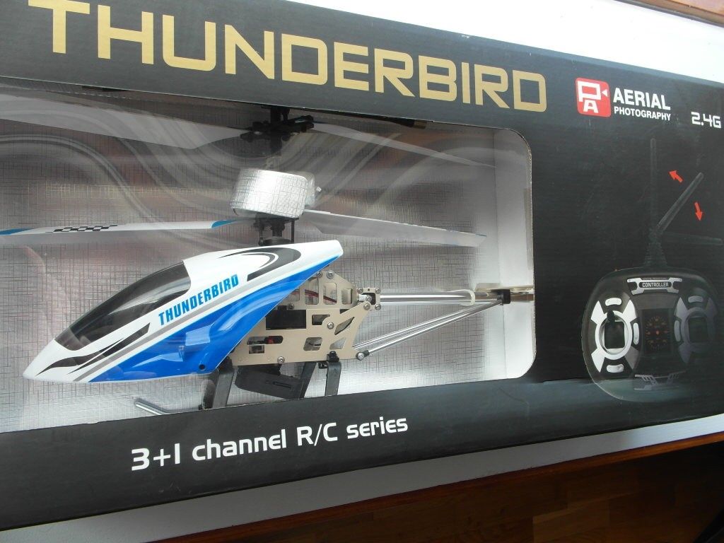 Selger ett Thunderbird helikopter nytt i eske. Setter du i ett micro sd kort kan det filme eller ta bilder, har 2,4Ghz fjernkontroll 3+1 channel type R/C series modell Aries foto Merke JIAYUAN Model Bruker vanlige batterier ikke oppladbare med. Har og innebygd Gyroscope. Alder 14 år +