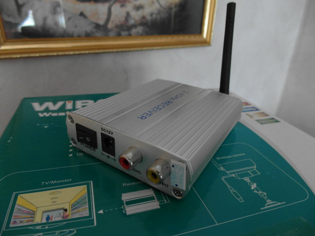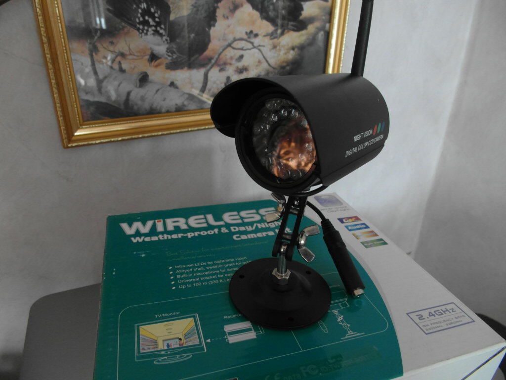 Security camera med 2,4GHz mottaker. Inntil 4 kamera mulig. Med 2 strømadaptere,RCA kabel som kobles TV/monitor. CCD 28IR kamera for inntil 50meters lenge. Kanal 1 kamera av 4 mulige kanaler i boksen.