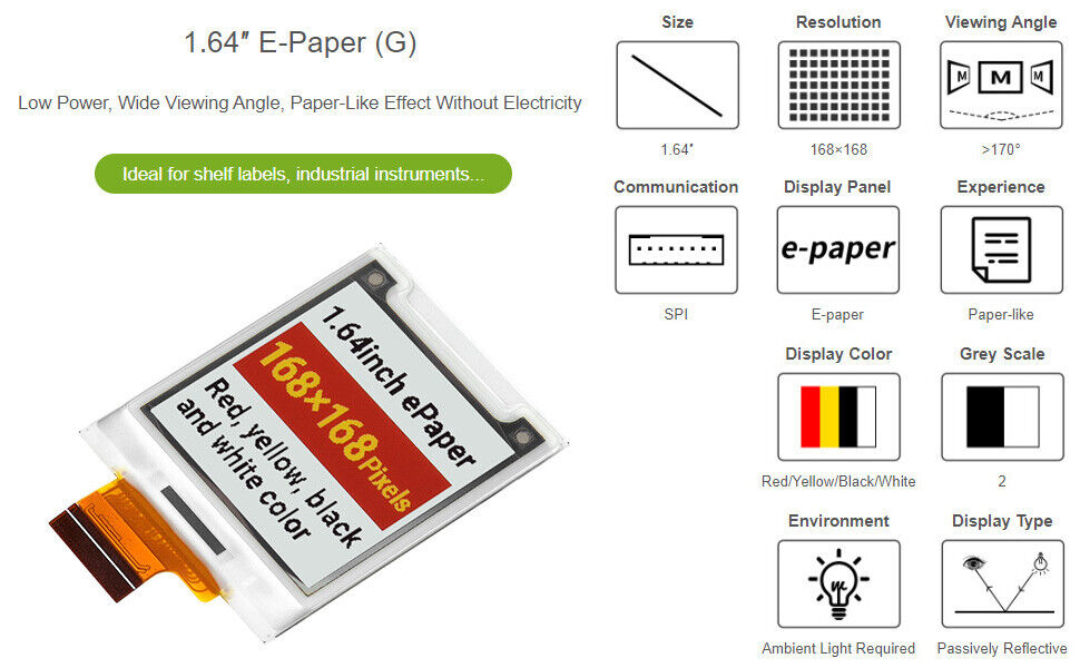 1.64inch square E-Paper (G) raw display, 168 × 168, Red/Yellow/Black/White Low Power, Wide Viewing Angle