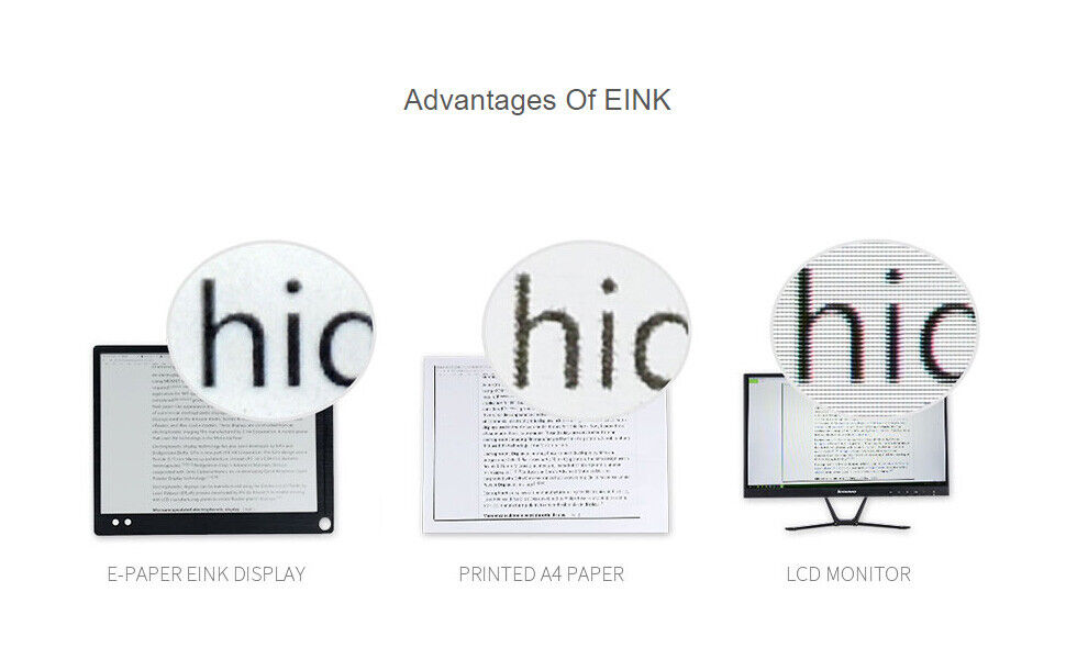 E-paper display will clearly display images/texts under lamplight or natural light, requires no backlight, and features nearly up to 180° viewing angle. It is usually used as e-reader due to its paper-like effect.